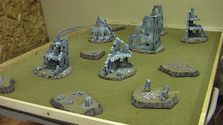 Below you can see the Battle Field we set up at Aether Storm Games, a Game Store down the corner from my house. Mike is the owner and a great guy, he always keeps an area open for us WH40k guys, regardless of what events he has going on.